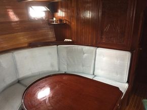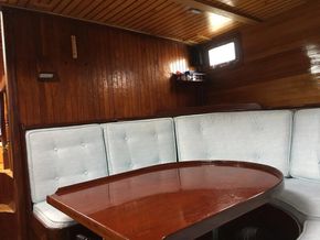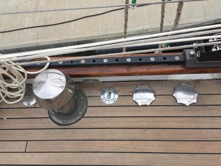 Powered by a 4.4L JCB engine with PRM750 transmission and a under power controllable pitch WEST MEKAN propeller, she delivers reliable, efficient performance. On deck, you’ll find stainless steel guardrails, butterfly hatches, deck prisms, and a beautifully crafted helm. Modern navigation systems and brand new sails make her ready for long range cruising.