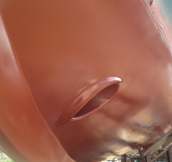 The hull, under the water line, have been sanded down to the fiberglass and after that rebuild with in